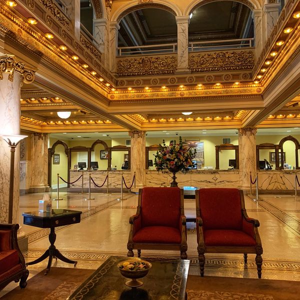 The French Lick Springs Hotel lobby is characterized by its large, modern, gold-gilded ceiling mural called "Pluto's World," which was installed during a 2005-2006 renovation. The mural, created by Conrad Schmidt Studios, depicts mythological scenes including Pluto, his wife Proserpine, and the mythological underworld, explaining the seasons. This grand, restored lobby is a central feature of the historic French Lick Resort